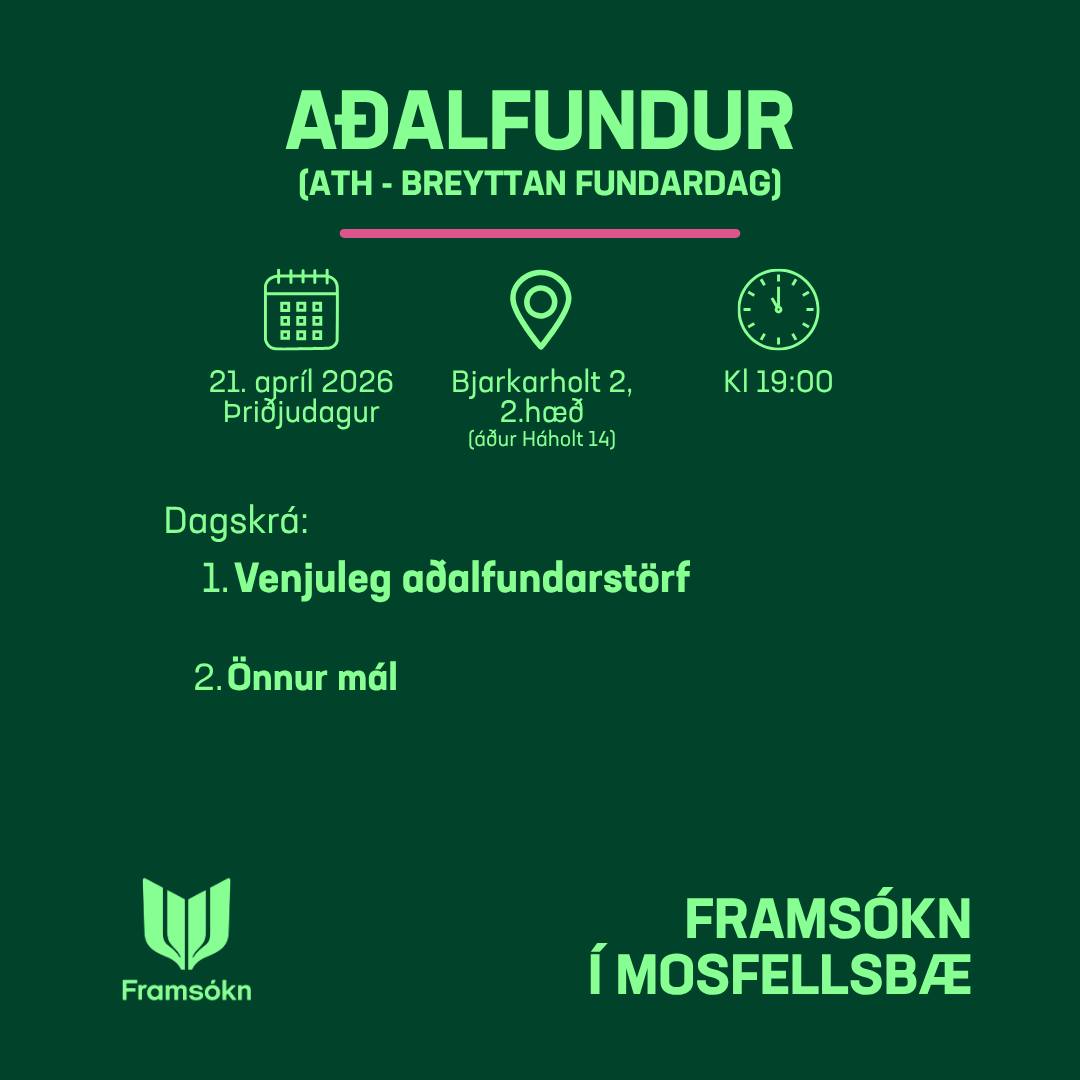 Aðalfundur Framsóknarfélags Mosfellsbæjar verður haldinn þriðjudaginn 21. apríl n.k. í aðstöðu félagsins kl. 19:00.
