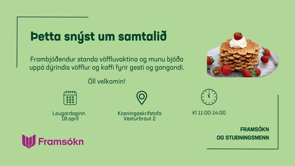 Á laugardag, 18. apríl kl.11-14 ætla frambjóðendur Framsóknar og stuðningsmanna að bjóða uppá vöfflur og kaffi á kosningaskrifstofunni að Vesturbraut 2.