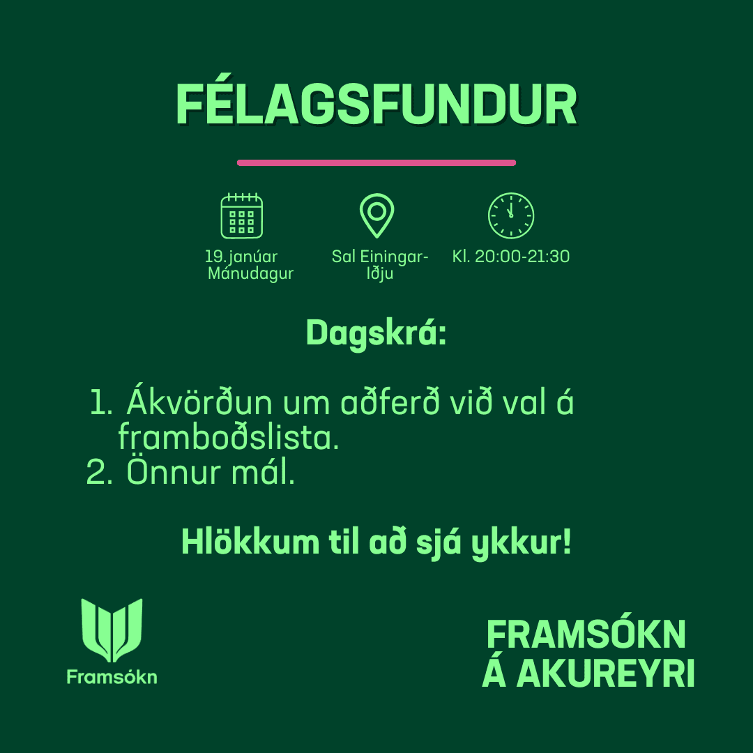 Félagsfundur Framsóknar á Akureyri verður mánudaginn 19. janúar kl 20.00-21:30 í Sal Einingar - Iðju.