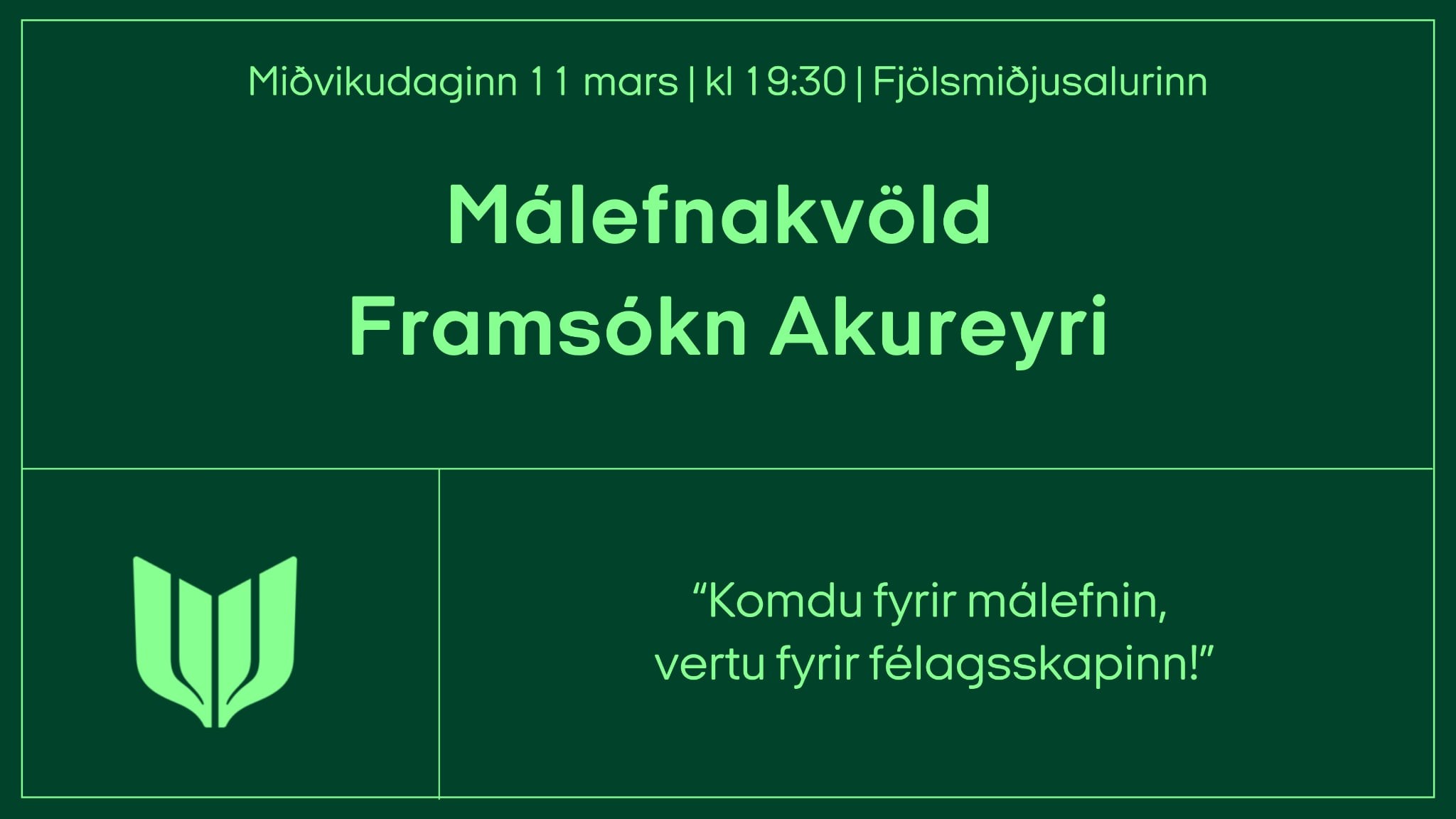 Framsókn á Akureyri boðar til málefnakvölds miðvikudagskvöldið 11. mars klukkan 19:30 í Fjölsmiðjunni í tilefni bæjarstjórnarkosninga í vor. Hlakka til að sjá ykkur sem flest.
