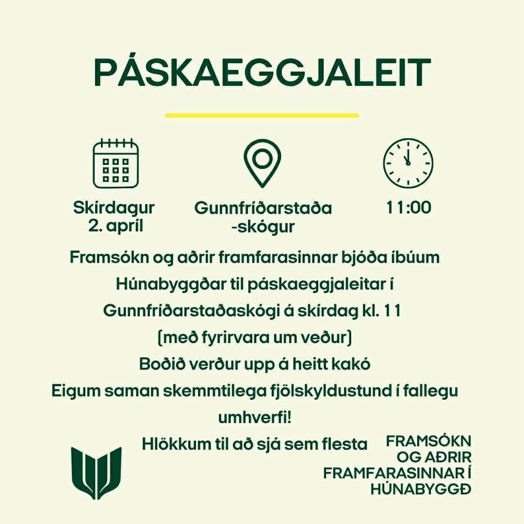 Framsókn & aðrir framfarasinnar bjóða íbúum Húnabyggðar til páskaeggjaleitar í Gunnfríðarstaðaskógi á skírdag kl. 11:00 (Með fyrirvara um veður).